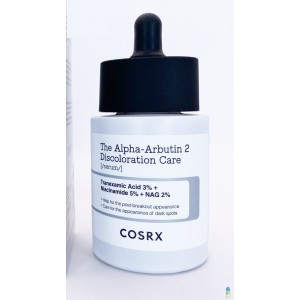 Découvrez la solution ultime pour un teint éclatant avec le sérum COSRX The Alpha-Arbutin 2 Discoloration Care Serum de 50 ml. Spécialement formulé pour atténuer les taches pigmentaires et unifier le teint, ce sérum léger pénètre en profondeur pour une peau visiblement plus lumineuse et uniforme. ✔ Points forts : Alpha-Arbutin : réduit efficacement l’apparence des taches brunes et améliore l’uniformité du teint. Texture légère et non collante : s’absorbe rapidement, laissant la peau douce et hydratéeProtection antioxydante : protège la peau des agressions extérieures et des radicaux libres. Convient à tous les types de peau : doux même pour les peaux sensibles. Formulé pour maximiser les résultats tout en minimisant les irritations. Intégrez-le à votre routine beauté quotidienne pour un visage radieux et harmonieux. Un must-have pour une peau de rêve en toute simplicité ! Utilisation : Après avoir nettoyé et tonifié votre visage, appliquez quelques gouttes du sérum COSRX The Alpha-Arbutin 2 Discoloration Care Serum sur la peau sèche, matin et soir. Massez doucement jusqu’à absorption complète. Poursuivez avec votre crème hydratante et, le matin, un écran solaire.