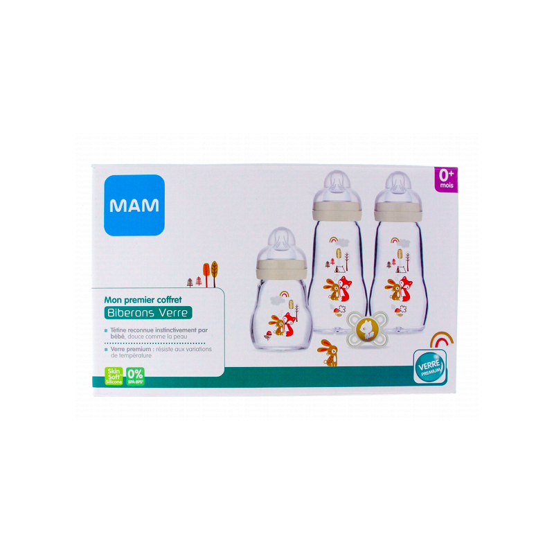 Composition : MAM Coffret Biberons Verre (3 Biberons + 1 Sucette), biberons MAM Feel Good verre premium, coffret naissance, sucette naissance ultra-douce en silicone.