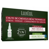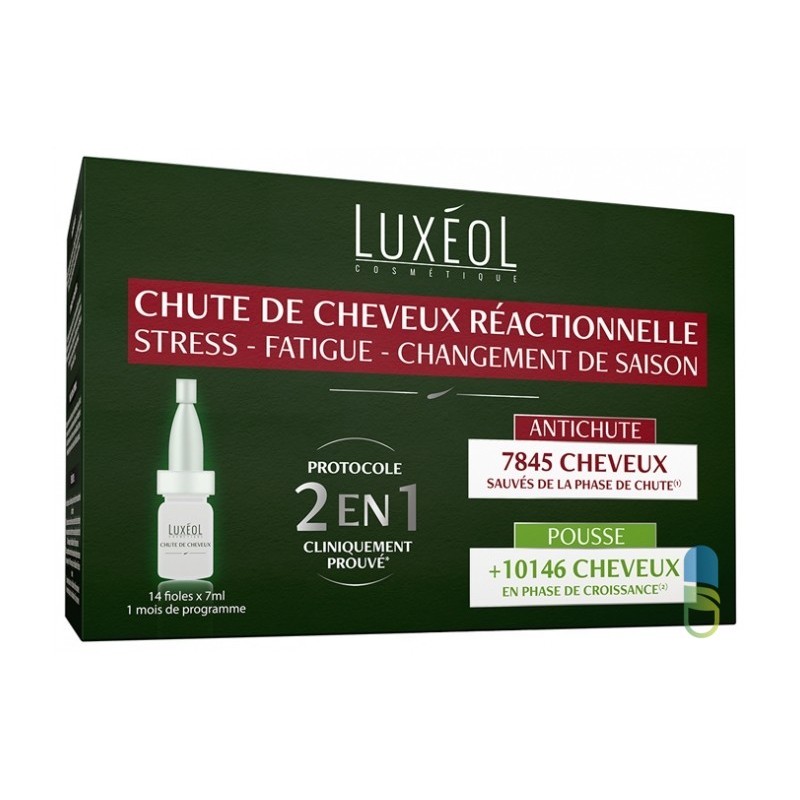 LUXEOLChute de cheveux Réactionnelle 2en1Stress, fatigue, changement de saisonFormule enrichie en extrait de kératineContenance : 14 fioles x 7 ml, soit 1 mois de programmeChute de cheveux Réactionnelle 2en1 de Luxeol, une formule enrichie en extrait de kératine.QU’EST-CE QUE LA CHUTE DE CHEVEUX RÉACTIONNELLE ? La chute de cheveux réactionnelle, appelée également chute de cheveux passagère, est généralement inférieure à 6 mois. Elle peut être provoquée par la fatigue, les carences en vitamines et minéraux, le stress, le surmenage, un changement ou un déséquilibre dans le quotidien ou encore un changement de saison.Etude clinique :- Antichute :7845 cheveux sauvés de la phase de chute(1)- Pousse :+10146 cheveux en phase de croissance(2)Résultats : * Une étude clinique sur 50 volontaires ayant une chute de cheveux réactionnelle a démontré : (1) Une diminution du nombre de cheveux en phase de chute (phase télogène) soit une augmentation du nombre de cheveux sauvés de la phase de chute de 7845 cheveux après 3 mois d’utilisation de 3 fioles par semaine. (2) Une augmentation du nombre de cheveux existants en phase de croissance (phase anagène) de + 10146 cheveux après 3 mois d’utilisation de 3 fioles par semaine. (3) moyenne globale, après 1 mois d’utilisation de 3 fioles par semaine. (4) moyenne globale, après 2 mois d’utilisation de 3 fioles par semaine.% de satisfaction :Les cheveux sont plus résistants : 90%* Les cheveux sont plus hydratés : 88%*Les cheveux retrouvent vitalité : 90%*Les cheveux sont plus forts : 88%*Les cheveux sont plus brillants : 84%*Les cheveux sont plus doux au toucher : 90%*Les cheveux sont moins cassants : 86%*Satisfaction globale : 94%*