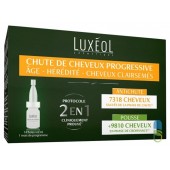 LUXEOLChute de cheveux Progressive 2en1Age, hérédité, cheveux clairsemésFormule composée à 98% d'ingrédients d'origine naturelle**Contenance : 14 fioles x 6 ml, soit 1 mois de programme.Chute de cheveux Progressive 2en1 de Luxeol, une formule Formule composée à 98% d'ingrédients d'origine naturelle**QU’EST-CE QUE LA CHUTE DE CHEVEUX PROGRESSIVE ? La chute de cheveux progressive est généralement supérieure à 6 mois. Elle peut être provoquée par différents facteurs pouvant intervenir au cours de la vie tels que l’âge, le côté héréditaire ou une perte de cheveux supérieure à la moyenne, pouvant conduire sur le long terme à des cheveux clairsemés.L'étude clinique :Antichute : 7318 cheveux sauvés de la phase de chute(1)Pousse : +9810 cheveux en phase de croissance(2)* Ce protocole a fait l’objet de deux études cliniques dont une sur 27 hommes et l’autre sur 28 femmes, ayant une chute de cheveux progressiveRésultats chez les hommes :Après 3 mois d’utilisation de 3 fioles par semaine, l’étude sur les hommes a démontré :(1) Une diminution du nombre de cheveux en phase de chute (phase télogène) soit une augmentation du nombrede cheveux sauvés de la phase de chute de 7318 cheveux.(2) Une augmentation du nombre de cheveux existants en phase de croissance (phase anagène) de +9810 cheveux.(3) moyenne globale, 27 hommes, 3 fioles par semaine pendant 1 mois.(4) moyenne globale, 27 hommes, 3 fioles par semaine pendant 2 mois.Résultats chez les femmes : Après 3 mois d’utilisation de 3 fioles par semaine, l’étude sur les femmes a démontré : Une diminution du nombre de cheveux en phase de chute (phase télogène) soit une augmentation du nombre de cheveux sauvés de la phase de chute de 5660 cheveux ainsi qu’une augmentation du nombre de cheveux existants en phase de croissance (phase anagène) de +8112 cheveux.** % d’ingrédients d’origine naturelle selon la norme ISO 16128.