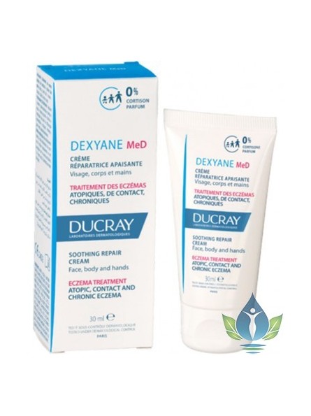 DUCRAY DEXYANE MED Crème réparatrice apaisante. La crème réparatrice apaisante Dexyane MeD de Ducray est conseillée dans les cas d'eczémas atopiques, de contact, chroniques des mains, du visage et du corps. Cette crème répare la barrière cutanée abimée et corrige sa sècheresse, elle soulage les démangeaisons et réduit les rougeurs et irritations et préserve la peau en limitant l'adhésion bactérienne. Sans cortisone. Sans paraben. Sans parfum.