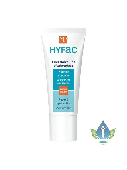 HYFAC + Emulsion fluide hydratante. Spécialement élaborée pour réhydrater, réguler et apaiser les peaux grasses ou irritées. Elle associe : le PCA Na hydro fixateur puissant qui garantit une hydratation optimale, le PCA Zn régulateur de la sécrétion de sébum et l’acide 18 b glycyrrhétinique qui apaise les sensations d’irritations provoquées par les agents extérieurs.