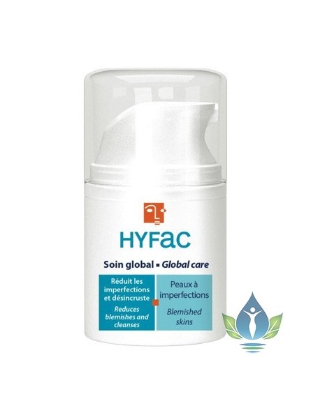 HYFAC Soin Global. Le soin global HYFAC réduit les imperfections et désincruste les pores. Il agit à 3 niveaux. Il lutte contre les "boutons" inflammatoires par la présence de Piroctone-Olamine. Il réduit l'apparition des comédons par la présence d'AHA et agit contre le dessèchement par la présence d'agents hydratants. Enrichi d'un absorbeur de sébum, il laisse la peau mate durablement. Ce soin kératolytique purifie la peau, désincruste les pores et prévient la formation des imperfections. Son application quotidienne permet à la peau de retrouver son équilibre physiologique. Idéal en base de maquillage.