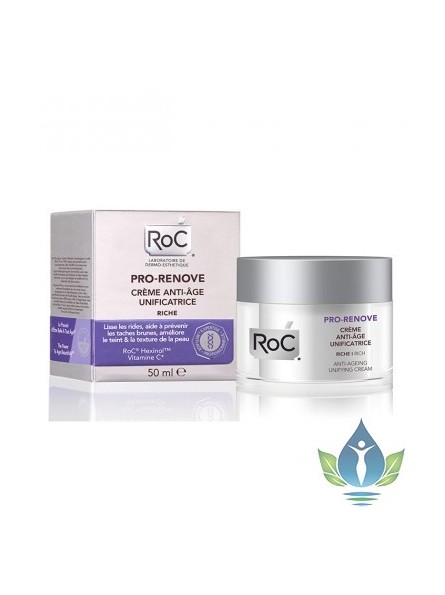 ROC PRO-RENOVE Crème anti-âge unificatrice Riche. Pour une peau intensément nourrie, des rides diminuées et un teint de peau visiblement plus uniforme et éclatant jour après jour. Cette crème offre une solution anti-âge complète pour unifier la peau en la révélant sous son meilleur jour. Elle lisse les rides, améliore le teint et la texture de la peau et prévient les taches brunes pour donner à la peau une apparence renouvelée. Contenant la technologie multi-actions Hexinol, issue de 7 ans de recherche, ce soin agit directement au coeur des cellules et cible le vieillissement à sa source, pour une efficacité visible. Sa texture riche et nourrissante pénètre rapidement.