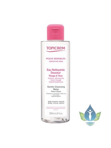TOPICREM Eau Nettoyante Douceur formulée sans parfum, nettoie le visage et les yeux des peaux sensibles de la famille. L’eau nettoyante laisse la peau propre, fraîche et nette. Sans paraben.