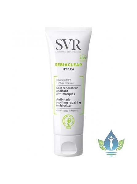 SVR SEBIACLEAR Hydra. SEBIACLEAR Hydra de SVR est un soin réparateur apaisant anti-marques et hydratant à destination des peaux à tendance acnéique sous traitement desséchant. Sa formule à la texture micro-aérée non grasse et non collante laisse la peau matifiée. Grâce au niacinamide aux vertus anti-inflammatoires, les marques rouges sont atténuées et la peau est apaisée. Les omégas céramides aident à restaurer la barrière cutanée. Hydra apporte une hydratation pour une durée de 48 heures. La peau est apaisée, réparée, les rugosités et les résidus cutanés sont réduits. Hypoallergénique. Non comédogène. Sans parabène. pH physiologique. Parfum frais sans allergène.