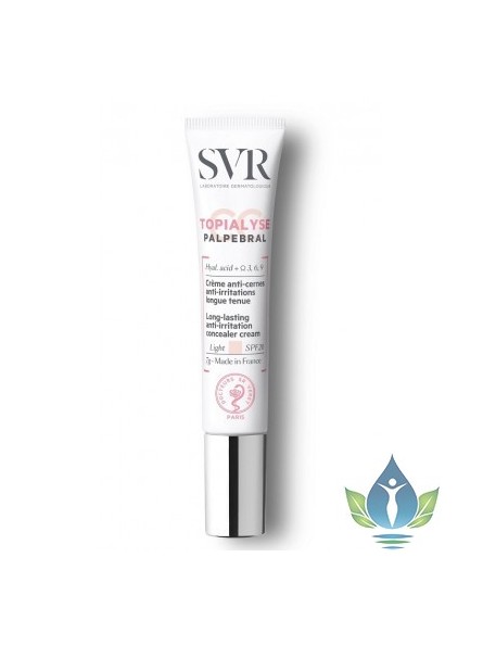 La crème anti-cernes light Topialyse Palpébral CC des Laboratoires SVR, une crème apaisante anti-cernes spécialement formulée pour les peaux sensibles et atopiques. Elle permet d'apaiser les irritations du contour des yeux et des paupières sèches à irritées. Formulée à base d'Oméga 3, 6 et 9 associés à l'Acide hyaluronique et à de l'acide Glycyrrhizique. L'acide hyaluronique permet de rajeunir le regard grâce à son action lissante, et hydrate la peau en restaurant la barrière cutanée pour protéger le contour de l’œil des agressions extérieurs. Les Oméga 3, 6 et 9 sont des acides gras qui diminuent l'intensité des réactions allergiques et apaisent la peau grâce à leur action anti-grattage et l'acide Glycyrrhizique possède une action anti-irritations pour apaiser l'hypersensibilité du contour des yeux. Elle agit efficacement afin d'apaiser les paupières et de limiter l'apparition des irritations. Dès son application, cette crème vous procure une sensation de confort immédiate. Sa texture crème permet une excellente hydratation du contour de l’œil ce qui permet au produit de bien s’imprégner pour une couvrance optimale des cernes toute la journée. La crème sous forme de correcteur haute couvrance offre une protection SPF 20 et est légèrement teintée. Sans parfum, sans paraben. Hypoallergénique. Testée sur paupières sensibles.