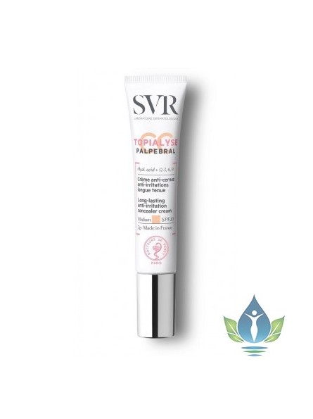 La crème anti-cernes médium Topialyse Palpébral CC des Laboratoires SVR, une crème apaisante anti-cernes spécialement formulée pour les peaux sensibles et atopiques. Elle permet d'apaiser les irritations du contour des yeux et des paupières sèches à irritées. Formulée à base d'Oméga 3, 6 et 9 associés à l'Acide hyaluronique et à de l'acide Glycyrrhizique. L'acide hyaluronique permet de rajeunir le regard grâce à son action lissante, et hydrate la peau en restaurant la barrière cutanée pour protéger le contour de l’œil des agressions extérieurs. Les Oméga 3, 6 et 9 sont des acides gras qui diminuent l'intensité des réactions allergiques et apaisent la peau grâce à leur action anti-grattage et l'acide Glycyrrhizique possède une action anti-irritations pour apaiser l'hypersensibilité du contour des yeux. Elle agit efficacement afin d'apaiser les paupières et de limiter l'apparition des irritations. Dès son application, cette crème vous procure une sensation de confort immédiate. Sa texture crème permet une excellente hydratation du contour de l’œil ce qui permet au produit de bien s’imprégner pour une couvrance optimale des cernes toute la journée. La crème sous forme de correcteur haute couvrance offre une protection SPF 20 et est légèrement teintée. Sans parfum, sans paraben. Hypoallergénique. Testée sur paupières sensibles.