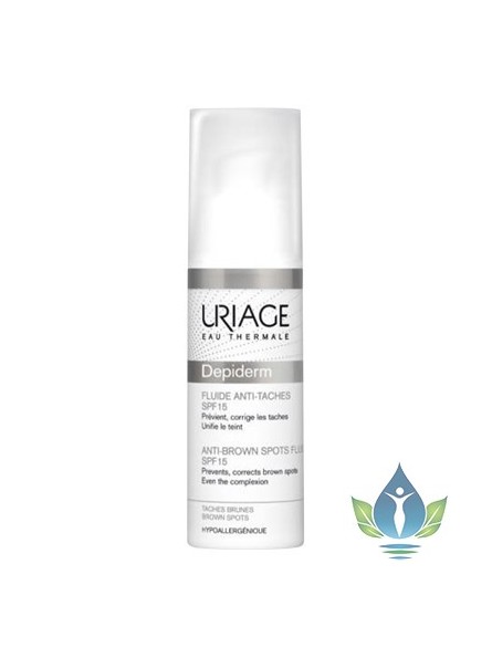 URIAGE DEPIDERM Fluide Anti-Taches SPF15. Le fluide anti-taches SPF15 corrige les taches brunes, unifie le teint et assure l'hydratation et la protection de la peau. Spécialement développé pour la dépigmentation des taches brunes, de sénescence, d'origine inflammatoire (UV, laser, ...), mélasma ou chloasma, il prévient l'apparition des taches brunes du visage, du décolleté et du cou. Il est constitué d'une association d'actifs innovants et performants pour une action performante sur les taches et l'unification du teint. Sa texture légère et fondante pénètre rapidement. Composé à base d'Eau Thermale d'Uriage, il hydrate, apaise et est anti-radicalaire.