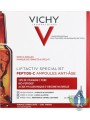 Les ampoules anti-âge Peptide-C Liftactiv Specialist des Laboratoires Vichy, un cocktail de vitamine C pure, biopeptides et acide hyaluronique pour corriger en profondeur les rides et ridules. Un format ampoule qui cible toutes les rides, le manque d'éclat et de tonicité. La vitamine C pure assure une action antirides en stimulant la production de collagène et d’élastine tout en améliorant la texture de la peau. Elle offre également une action antioxydante puissante en réduisant les dommages oxydatifs sur la peau et l’oxydation de la mélanine, et en améliorant le teint et l’éclat de la peau. Le complexe de bio-peptides permet de combler les rides et de resculpter les contours du visage. L’acide hyaluronique d’origine naturelle contribue à hydrater et à repulper la peau. Également enrichie en Eau thermale de Vichy, ce soin anti-âge en restitue les vertus minéralisantes et fortifiantes. Une seule ampoule suffit pour une journée, une moitié le matin et l’autre moitié le soir. Immédiatement, elle hydrate la peau tout en lui redonnant sa fermeté. Après 10 jours, la peau regagne en douceur et en luminosité. En un mois, les rides et ridules s’estompent et le visage est rayonnant d’une nouvelle jeunesse. Des ampoules sans parfum et sans paraben.