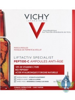 Les ampoules anti-âge Peptide-C Liftactiv Specialist des Laboratoires Vichy, un cocktail de vitamine C pure, biopeptides et acide hyaluronique pour corriger en profondeur les rides et ridules. Un format ampoule qui cible toutes les rides, le manque d'éclat et de tonicité. La vitamine C pure assure une action antirides en stimulant la production de collagène et d’élastine tout en améliorant la texture de la peau. Elle offre également une action antioxydante puissante en réduisant les dommages oxydatifs sur la peau et l’oxydation de la mélanine, et en améliorant le teint et l’éclat de la peau. Le complexe de bio-peptides permet de combler les rides et de resculpter les contours du visage. L’acide hyaluronique d’origine naturelle contribue à hydrater et à repulper la peau. Également enrichie en Eau thermale de Vichy, ce soin anti-âge en restitue les vertus minéralisantes et fortifiantes. Une seule ampoule suffit pour une journée, une moitié le matin et l’autre moitié le soir. Immédiatement, elle hydrate la peau tout en lui redonnant sa fermeté. Après 10 jours, la peau regagne en douceur et en luminosité. En un mois, les rides et ridules s’estompent et le visage est rayonnant d’une nouvelle jeunesse. Des ampoules sans parfum et sans paraben.