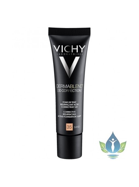 VICHY DERMABLEND 3D Sable N°35. DERMABLEND 3D Correction est un fond de teint resurfaçant actif correcteur 16H. Il offre une haute couvrance, une correction du relief et une action anti-imperfections. Spécialement conçu pour les peaux grasses à tendance acnéique il va masquer les imperfections en un seul geste. Enrichi en acide salicylique et en eperuline, sa formule agit sur la qualité de la peau et lui apporte une action apaisante. Le teint reste unifié et mat pendant 16H. La peau est souple et confortable. A l'application, sa texture fraîche et légère s'étire au contact de la peau en un voile ultra-couvrant. Parfaitement malléable, elle masque les défauts de relief en comblant les creux et en lissant les imperfections, tout en unifiant le teint. Couvrante mais aérienne, cette formule camoufle les défauts sans créer de surcharge, d'effet masque, ni pelucher. Comme fusionnés avec la peau, les pigments se fondent sur l'épiderme tout en masquant et lissant parfaitement les défauts pendant 16H. Convient aux peaux sensibles. Sans paraben. Non-comédogène.