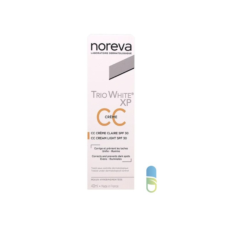 La crème claire Trio White XP CC SPF30 Noreva est un soin pour peaux hyperpigmentées spécialement conçu pour unifier et illuminer le teint tout en corrigeant les taches éventuelles et en prévenant leur réapparition. Elle apporte une couvrance absolue, procure un effet bonne mine et contient des filtres minéraux qui assurent une protection contre les UV SPF30.