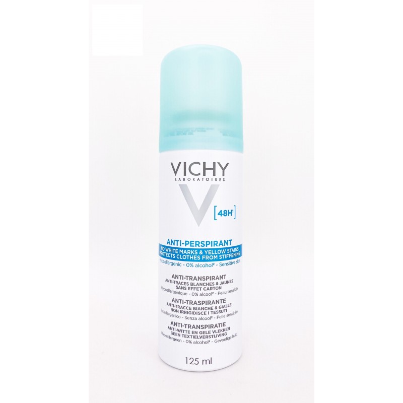 Ce déodorant anti-transpirant Vichy prévient l’apparition de traces blanches et jaunes sur les vêtements, susceptibles de durcir le tissu. Ce phénomène est dû à la présence de dissolvine dans sa formule, qui prévient les taches jaunes sur les vêtements blancs en chélatant les ions ++ présents dans la sueur. De plus, ce spray protège la peau de la transpiration jusqu’à 48 heures grâce au chlorhydrate d’aluminium, un sel d’aluminium très bien toléré par la peau. Son parfum frais aide à masquer les mauvaises odeurs liées à une transpiration intense. Sa formule hypoallergénique est testée dermatologiquement et convient aux peaux sensibles. Ingrédients : ISOBUTANE – AQUA / WATER / EAU – DIMÉTHICONE – CHLORHYDRATE D’ALUMINIUM – DIACÉTATE DE GLUTAMATE TÉTRASODIQUE – TOCOPHÉROL – DIMÉTHICONOL – LAURYL PEG-9 POLYDIMÉTHYLSILOXYÉTHYL DIMÉTHICONE – PHÉNOXYÉTHANOL – PARFUM / FRAGRANCE (F.I.L. N70032464/2).