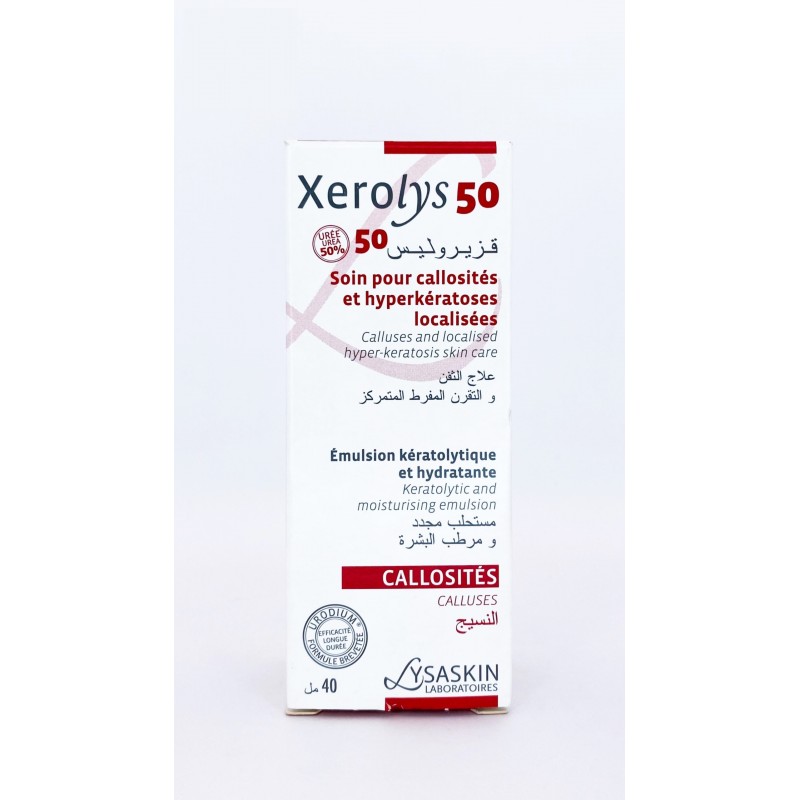 Xerolys50 est un soin kératolytique et hydratant pour les callosités (mains, coudes, pieds, ongles, cuir chevelu…). Il réduit l’épaisseur des callosités ou des hyperkératoses localisées. Xerolys50 apporte rapidement confort, souplesse et apaisement. L’URODIUM® contenu dans Xerolys50, est une formule active brevetée, qui améliore le pouvoir exfoliant et hydratant de l’Urée (dosé à 50% – Actif kératolytique et Facteur Naturel d’Hydratation de la peau) et surtout sa rémanence (action de très longue durée). L’association d’actifs contenue dans Xerolys50 (urée, chlorure de sodium, acide lactique et acide glycolique) permet une action plus efficace pour lutter contre l’épaississement de l’épiderme. Xerolys50 apporte aussi une hydratation intense et durable à la peau ainsi désépaissie. Le mode d’émulsion Eau dans Huile, par son effet filmogène, prolonge les propriétés kératolytiques et hydratantes de Xerolys50.