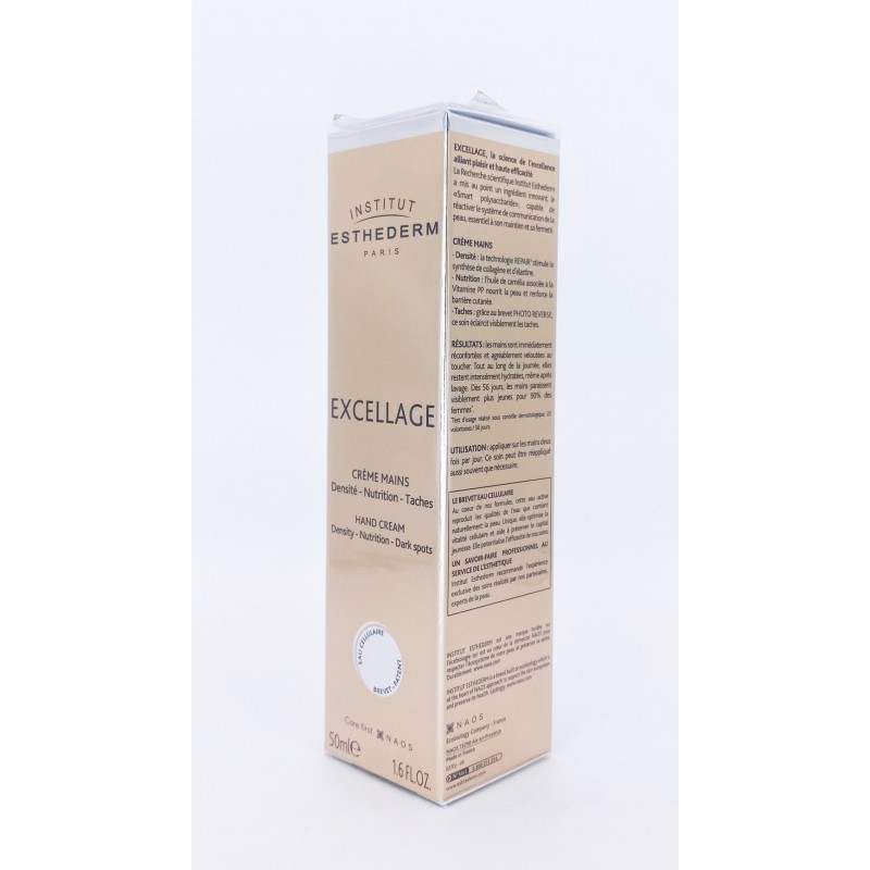 La Crème Mains Excellage est une crème mains à la texture fondante qui apporte : Densité : la technologie REPAIR+ stimule la synthèse de collagène et d’élastine. Nutrition : l’huile de camélia associée à la Vitamine PP nourrit la peau et renforce la barrière cutanée. Une action anti-taches : grâce au brevet PHOTO REVERSE, ce soin éclaircit visiblement les taches. Appliquer sur les mains deux fois par jour. Ce soin peut être réappliqué aussi souvent que nécessaire