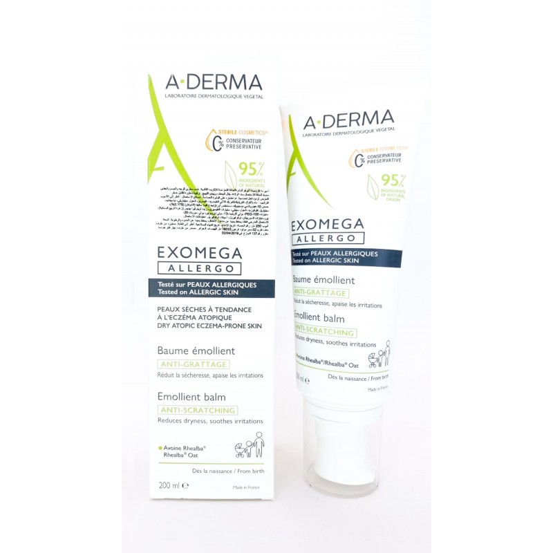 A-DERMA Exomega Allergo Baume Émollient Anti-Grattage est un soin visage et corps qui apaise la sécheresse, les rougeurs et irritations, réduit les démangeaisons au niveau des paupières des peaux sèches à tendance à l’eczéma atopique, dès la naissance. Sa formule à base d’extrait de plantules d’Avoine Rhealba® bénéficie de la technologie brevetée Cosmétique Stérile pour une application dès la naissance : Action triplement apaisante grâce à l’extrait de plantules d’Avoine Rhealba® renforcé par le BIOVECT, vecteur d’origine naturel, pour un apaisement des démangeaisons, la diminution des rougeurs et l’espacement des pics d’irritations. Elle réduit la sécheresse et renforce la barrière cutanée grâce à la ilaxérine, la vitamine B3 et au cœur émollient des formules.