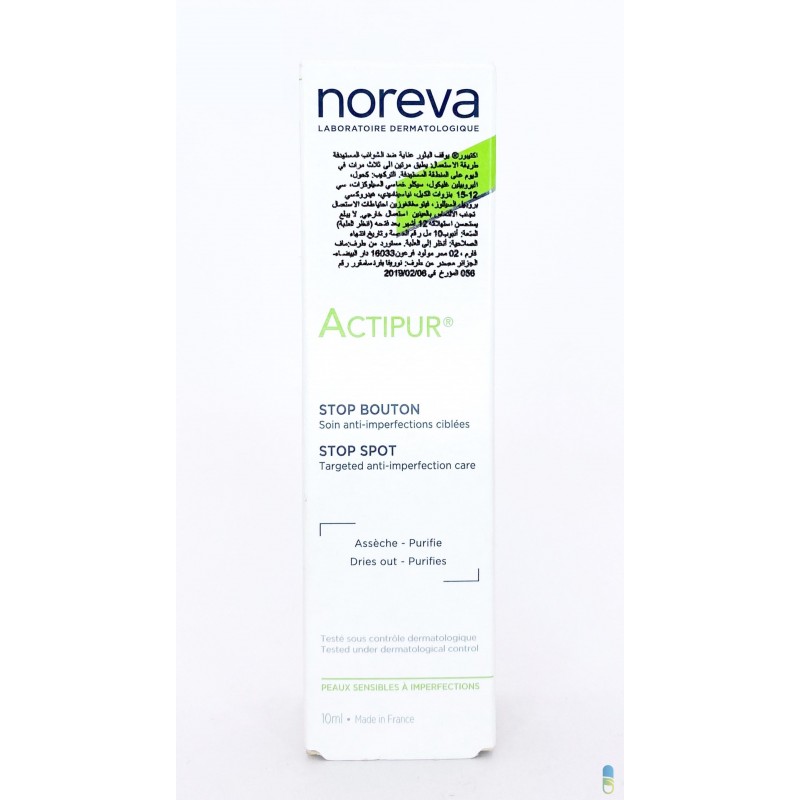Le soin anti-imperfections Actipur Stop Bouton est recommandé aux peaux à tendance acnéiques. Son action ciblée élimine les boutons et efface les imperfections localisées de la peau. Ce stop bouton à action ciblée comprend de la vitamine PP et du phytosphingosine. Ces composants du produit s’activent sur la peau tout en réduisant les irritations cutanées sur les points concernés. Ils effectuent ainsi des actions spécifiques à travers la surface épidermique. Stop bouton Actipur procure une peau plus saine lorsqu’il est appliqué quotidiennement. En peu de temps ses effets se font sentir, les imperfections désagréables visées seront rapidement éliminées. Ce traitement NOREVA à haute tolérance est adapté à tous types de peaux incluant les plus sensibles et l’exposition au soleil ne présente plus aucun danger photosensibilisant. Ne contenant ni parfum ni conservateur, il élimine tous risques de réactions allergiques. Il s’agit d’un moyen de traitement d’urgence à efficacité rapide. Utilisation : Appliquer bouton stop 2 à 3 fois par jours sur les zones concernées.