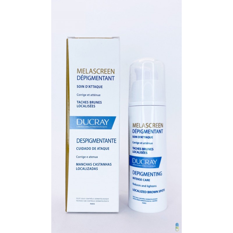 MELASCREEN DÉPIGMENTANT Soin d’attaque est un soin anti-tache brune qui agit sur les hyperpigmentations localisées sur le visage et le décolleté • Sa formule innovante hautement concentrée en deux actifs dépigmentants scientifiquement reconnus, délivre une action complémentaire : l’ACIDE AZÉLAÏQUE aide à atténuer les taches brunes et l’ACIDE GLYCOLIQUE affine la peau en accélérant l’élimination des cellules mortes de l’épiderme. Le mot de l’expert : Des taches brunes sur le visage, le décolleté et le dos des mains… Des marques qui témoignent d’un excès de soleil. Les effets du soleil sur la peau sont potentialisés par les hormones produites pendant la grossesse, ainsi que par la prise d’oestrogènes (pilule). Un « masque » peut alors apparaître sur le visage. L’âge peut également contribuer à accentuer les taches brunes. Utilisation : Appliquer matin et soir sur les zones concernées, en évitant le contact avec les yeux. Pour des résultats optimaux, utiliser pendant au moins 3 mois.