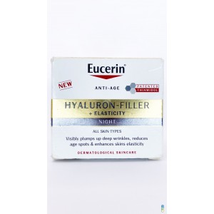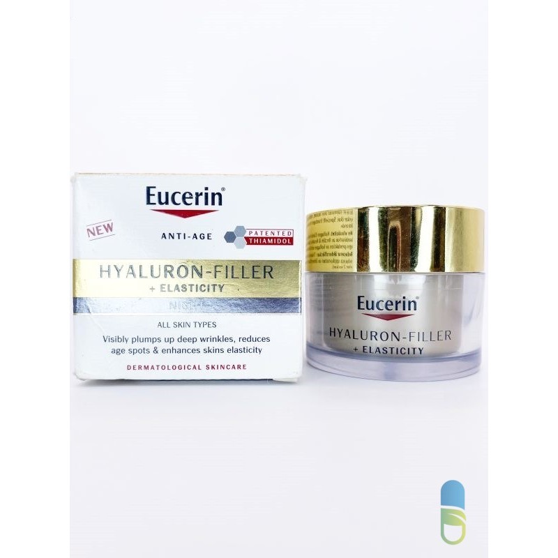 Le Soin de Nuit HYALURON-FILLER + ELASTICITY d’Eucerin est une crème anti-âge qui comble les rides profondes, améliore l’élasticité de la peau et réduit les taches liées à l’âge. La formule innovante offre des bénéfices anti-âge multiples. Le mélange d’Acide Hyaluronique de haut et bas poids moléculaire repulpe visiblement les rides profondes de l’épiderme, tandis que le Dexpanthenol aide la peau à se regénérer pendant la nuit. Le nouveau complexe Collagène-Élastine, une combinaison puissante d’Arctiine et de Créatine, redynamise la production de collagène et augmente l’élasticité de la peau. Enfin, le Thiamidol*, ingrédient breveté par Eucerin, réduit l’apparence des taches liées à l’âge pour une peau à l’apparence plus jeune, plus lisse et plus éclatante. Le Soin de Nuit contient également de l’huile d’Argan. Riche en lipides qui soignent la peau, il favorise la régénération et lisse la surface de la peau pendant la nuit.