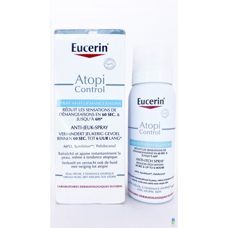 Eucerin Atopicontrol Spray Anti-démangeaisons – 50ml Spray hydratant pour peaux sensibles Soin pour peaux sujettes à l’eczéma et aux irritations La peau atopique est sèche et sujette aux irritations et aux sensations de démangeaisons. Ces sensations de démangeaisons provoquent des grattements qui nuisent à une bonne nuit de sommeil et peuvent avoir un impact négatif sur la qualité de vie. Eucerin AtopiControl Spray Anti-Démangeaisons a été spécialement formulé pour soulager les sensations de démangeaisons immédiatement et durablement. Il est cliniquement prouvé qu’il réduit les sensations de démangeaisons de la peau en moins de 60 secondes avec des résultats qui durent jusqu’à six heures. Ce spray innovant contient un complexe unique d’ingrédients anti-démangeaisons qui combat la sensation de démangeaison à plusieurs niveaux pour rafraîchir, calmer et apaiser instantanément la peau irritée :