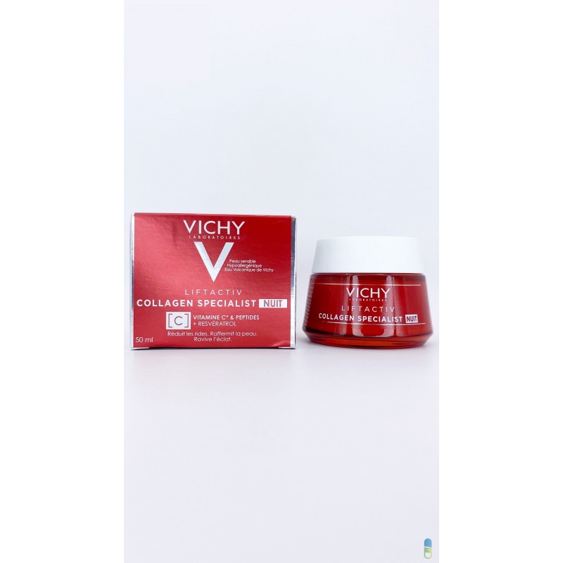Vichy Liftactiv Collagen Specialist Nuit est la 1ère crème de nuit de Vichy enrichie en Peptides anti-âge raffermissants et en VitamineCg pro-éclat + en Resvératrol d’origine naturelle, connu pour son action sur le teint irrégulier. Pendant la nuit, son action progressive corrige les dommages accumulés au cours de la journée et renforce la peau contre les agressions extérieures. La peau est repulpée et fraîche au réveil.